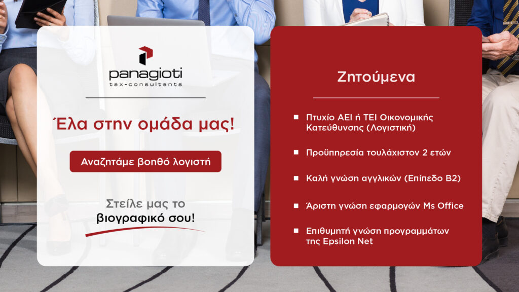 Η ομάδα μας μεγαλώνει! Ενδιαφέρεσαι για τη θέση βοηθού λογιστή; Έλα στην ομάδα μας! Απαραίτητα προσόντα:Πτυχίο ΑΕΙ / ΤΕΙ Οικονομικής Κατεύθυνσης / ΛογιστικήςΑπαραίτητη προϋπηρεσία τουλάχιστον 2 ετώνΚαλή γνώση ΑγγλικώνΆριστη γνώση εφαρμογών Ms OfficeΑξιοπιστία και υπευθυνότηταΙκανότητα τήρησης χρονοδιαγράμματος Επιπλέον επιθυμητά προσόντα:Γνώση προγραμμάτων της Epsilon Στείλε μας το βιογραφικό σου και τα στοιχεία σου στην παρακάτω φόρμα […]